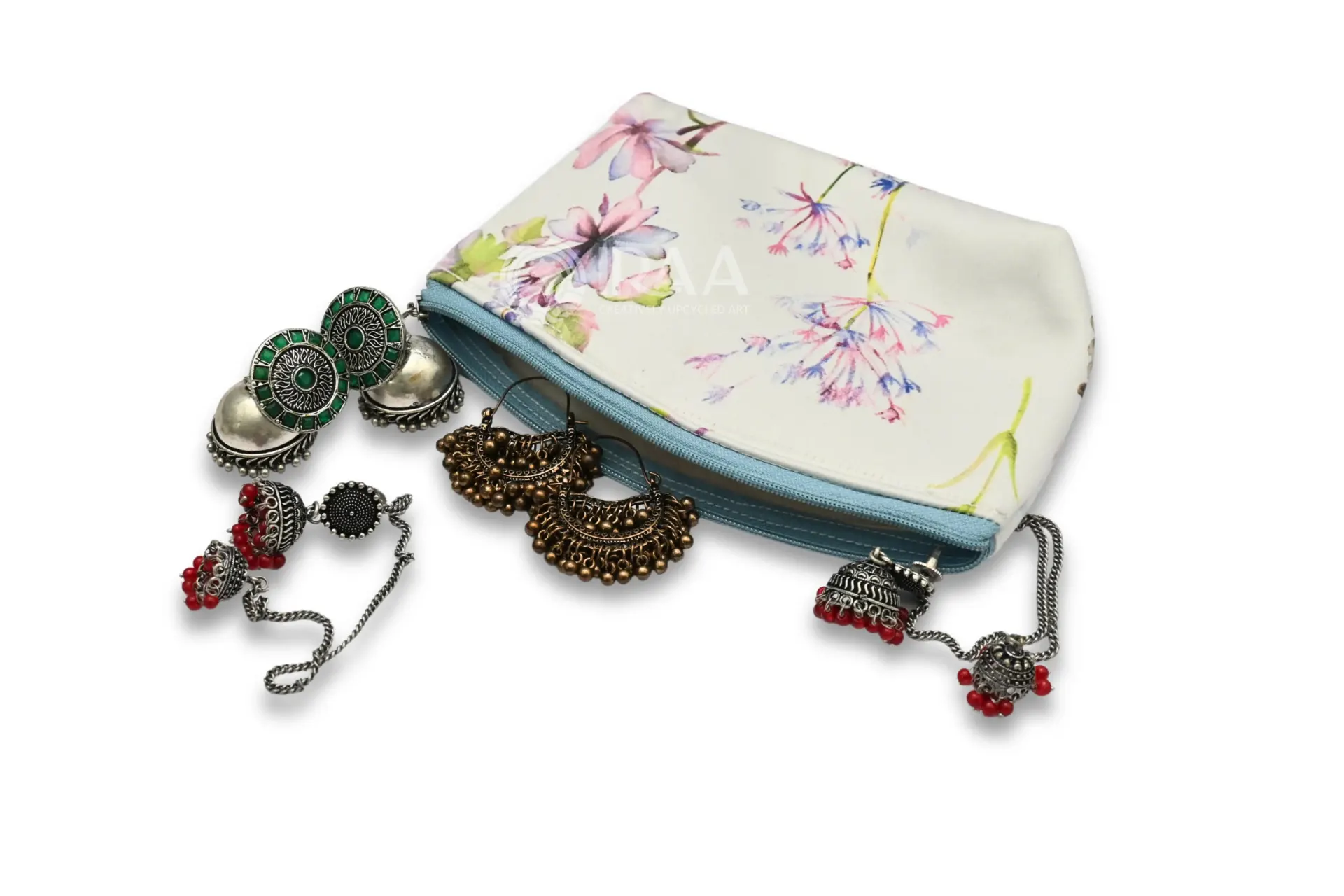Multi-purpose satin pouch for jewellery or cosmetics.